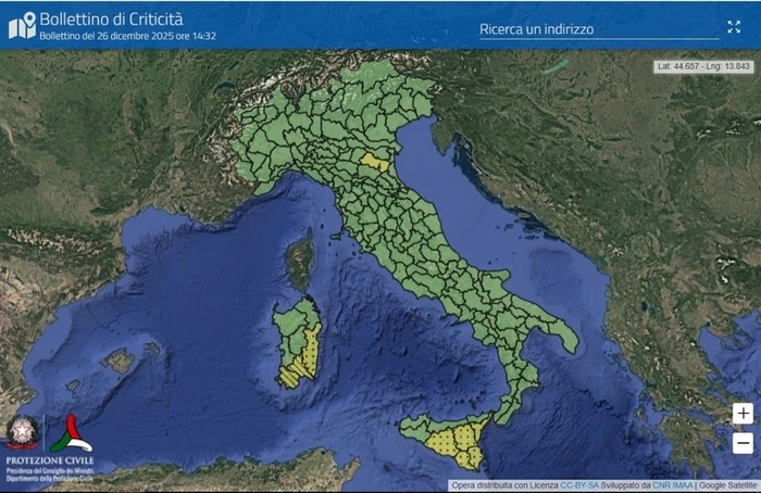 Sulla base dei fenomeni previsti e in atto è stata valutata per la giornata di sabato 27 dicembre, allerta gialla su settori Sardegna, Sicilia e parte dell’Emilia Romagna .