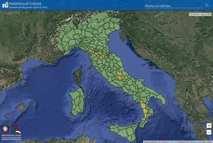 Sulla base dei fenomeni previsti, la protezione civile ha emesso per la giornata di venerdì 9 gennaio un'allerta gialla su parte di Toscana, Abruzzo, Basilicata e Calabria.