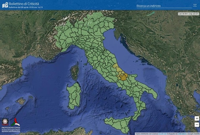 La Protezione Civile ha valutato, per la giornata di giovedì 9 Aprile, ALLERTA ARANCIONE per rischio idrogeologico su alcuni settori di Abruzzo e Molise; ALLERTA GIALLA, sempre per rischio idrogeologico, su resto di Molise e Abruzzo.