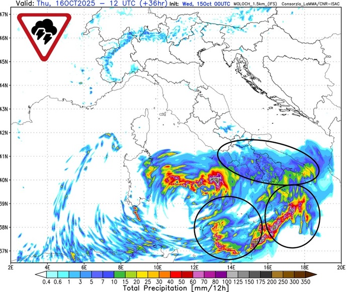 Nel corso di Giovedì 16 Ottobre il ciclone farà sentire i suoi effetti, provocando maltempo estremo sulla Sicilia (meridionale e orientale), sulla fascia ionica della Calabria, nonché in Puglia e sulla Campania (Capri, Ischia e le zone costiere).