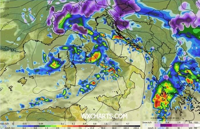 Nel corso della prossima notte di Natale, infine, mentre il maltempo insisterà soprattutto su Emilia-Romagna, Nord-Ovest e regioni tirreniche, il vortice ciclonico inizierà a spostarsi dal largo delle coste occidentali della Corsica verso le Isole Baleari; ciò condizionerà il tempo anche durante la giornata di Natale.