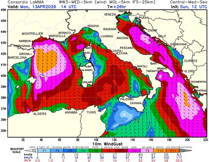 La Liguria è sferzata da un'intensa Tramontana: nella mattinata di Lunedì 13 Aprile si sono già registrate raffiche fino a 70-80 km/h sul Genovesato di Ponente; nel contempo, la Sardegna occidentale deve fare i conti con un Maestrale decisamente sostenuto, che potrà toccare i 90 km/h nelle prossime ore.