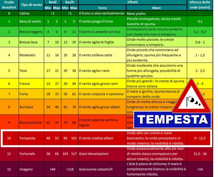 Il termine “tempesta” viene utilizzato in meteorologia quando il vento raggiunge o supera determinati valori di intensità, generalmente associati a raffiche tra gli 89 e i 102 km/h, come possiamo vedere dalla classificazione della scala di Beaufort qui sotto.
