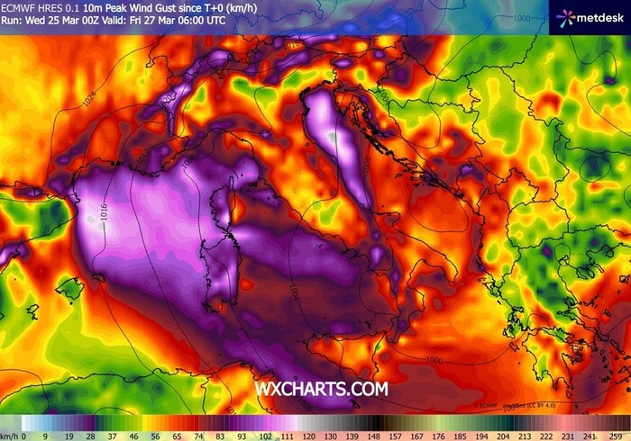 - il Maestrale soffierà con raffiche ad oltre 100 km/h sulla Sardegna (settori occidentali dell'Isola) e sulla Sicilia, per poi estendersi a tutto il versante tirrenico;