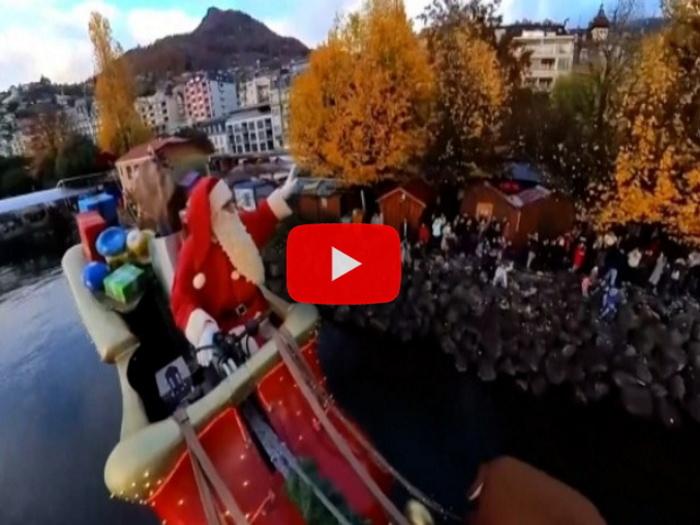 La traiettoria parte dal molo di Montreux e si spinge sopra le acque del lago, dove Babbo Natale si concede una breve pausa prima di mostrare le sue abilità con un sorprendente turbo boost, che lo porta ancora più lontano e più in alto nel cielo invernale.