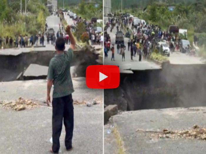 Nel video diffuso sui social si vede la carreggiata vacillare per alcuni istanti, mentre il terreno sottostante cede rapidamente sotto la pressione del flusso idrico. Pochi secondi dopo, l’intera struttura crolla, lasciando spazio a un enorme buco nel quale sparisce l’asfalto.