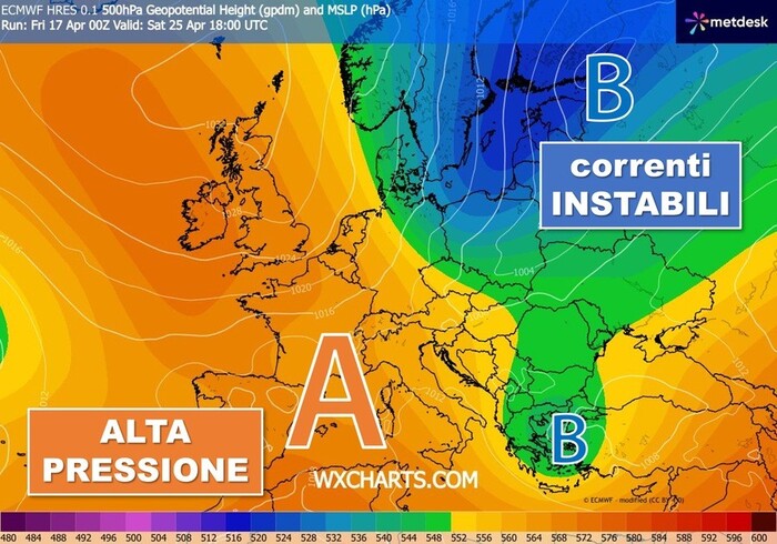 Tuttavia, l'alta pressione potrebbe non risultare così granitica: infatti, già nei giorni a seguire, sul lato orientale di questo campo anticiclonico potrebbero insinuarsi delle correnti più instabili in discesa dal Nord Europa. Le regioni del Nord e quelle adriatiche rimarrebbero più scoperte e maggiormente esposte all'ingresso di correnti d'aria instabili dall'Atlantico: si tratterebbe della la classica configurazione che favorisce l'innesco di focolai temporaleschi durante le ore pomeridiane sia sulle zone di montagna, sia su quelle di pianura. Questi fenomeni, lo ricordiamo, durano solitamente poche ore (1 o 2 al massimo) e poi il sole torna a splendere in cielo; insomma, la classica variabilità primaverile.