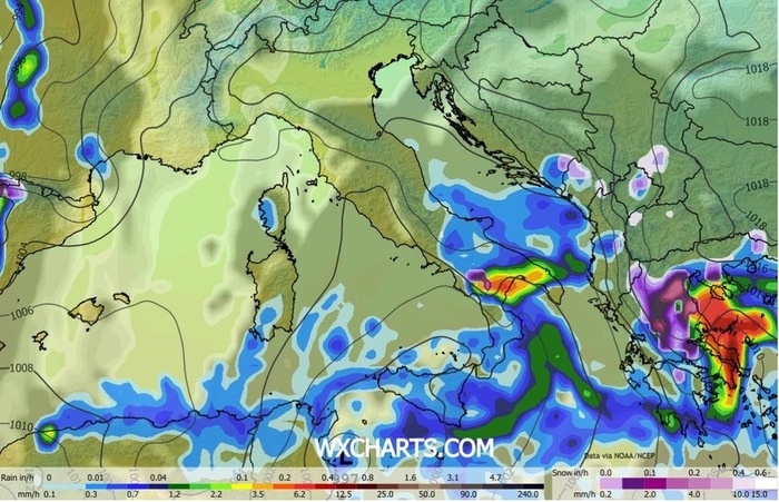 Per questo motivo, le condizioni meteorologiche continueranno a rimanere ancora instabili: in mattinata, piogge a tratti intense insisteranno sui settori orientali della Sardegna e della Sicilia; tuttavia, con il passare delle ore, la parte più attiva delle precipitazioni tenderà gradualmente a concentrarsi sul comparto ionico, inizialmente su quello calabrese e successivamente anche tra Basilicata e Puglia. In queste zone il maltempo persisterà almeno fino alla serata, estendendosi temporaneamente anche ad alcuni tratti del medio e basso versante adriatico.