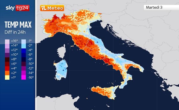 Come evidenzia la cartina qui sotto, a risentire maggiormente dell’ennesima anomalia termica saranno soprattutto i settori occidentali del Paese, in particolare le regioni del Nord-Ovest e l’intero versante tirrenico. Su queste aree le temperature massime saliranno di ben 6°C rispetto alla giornata di Lunedì 2 Marzo, ovvero in sole 24 ore.