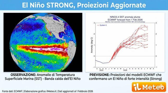 Le acque dell'Oceano Pacifico equatoriale si stanno surriscaldando a ritmi serrati. Gli ultimi aggiornamenti confermano l'arrivo di un El Niño di forte intensità (Strong): non si tratta di un semplice fenomeno oceanico lontano, ma del colossale interruttore climatico globale. Questo immane rilascio di calore scatenerà un "effetto domino" planetario, con conseguenze su Estate ed Autunno per l'Europa e l'Italia.