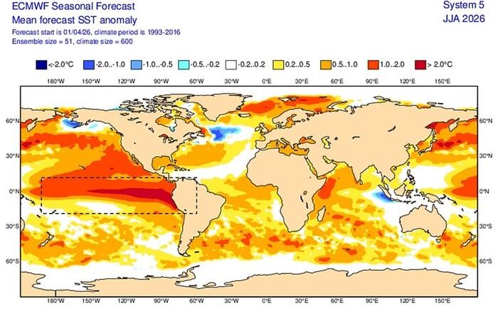 Parliamo di El Niño Strong quando questa lingua di acqua calda oceanica registra un'anomalia termica superiore ai +1,5°C/+2,0°C rispetto alla media storica. È un'enorme quantità di calore extra che l'oceano inizia a rilasciare direttamente nell'atmosfera, alterando la circolazione dei venti su scala planetaria. La mappa qui sotto mette bene in evidenza l'anomalia attesa proprio nella zone del Pacifico orientale.