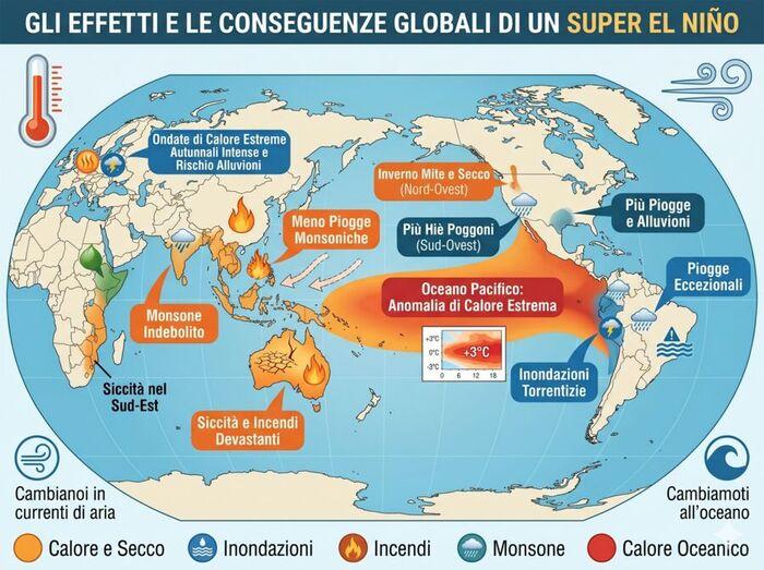 Un Super El Niño funziona come un gigantesco termosifone per il pianeta. Il calore rilasciato dall'oceano si somma al riscaldamento globale di origine antropica. Non a caso, gli anni caratterizzati da un forte El Niño coincidono quasi sempre con i record assoluti di caldo a livello mondiale. Poiché l'acqua calda (e le relative nuvole cariche di pioggia) si è spostata verso le Americhe, l'Australia, l'Indonesia e il Sud-est asiatico rimangono letteralmente a secco. In queste aree, uno Strong El Niño è sinonimo di siccità severa, raccolti agricoli distrutti e un aumento drammatico del rischio di vasti incendi boschivi.