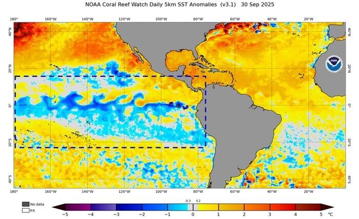 Secondo gli ultimi aggiornamenti della NOAA, l’agenzia statunitense che si occupa di dinamiche oceaniche ed atmosferiche, le acque superficiali dell’Oceano Pacifico si stanno raffreddando rapidamente e quindi la Niña è ormai confermata per i prossimi mesi autunnali e invernali. La mappa qui sotto mostra bene l'anomalia fredda (rettangolo) proprio in pieno Oceano Pacifico.