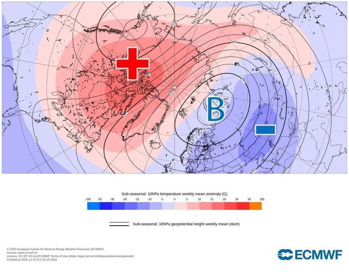 Sostanzialmente, il vortice polare potrebbe perdere coesione e andare in crisi, con l’aria gelida che avrebbe dunque la possibilità di scivolare verso sud, portando con sé ondate di freddo intenso, maltempo e scenari meteorologici più estremi. Nella mappa qui sotto possiamo notare un'area con temperature sopra la media (indicate con il +) e zone più fredde (indicate con il -); da qui si evince chiaramente un vortice polare tutt'altro che compatto ed anzi diviso in due settori ben distinti.