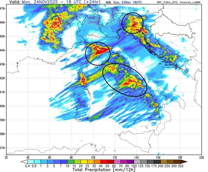 Questo tipo di configurazione favorisce lo scontro tra masse d'aria di origine diversa aumentando di conseguenza il rischio di eventi meteo estremi come nubifragi, già nel corso delle prossime ore di Lunedì 24 Novembre.