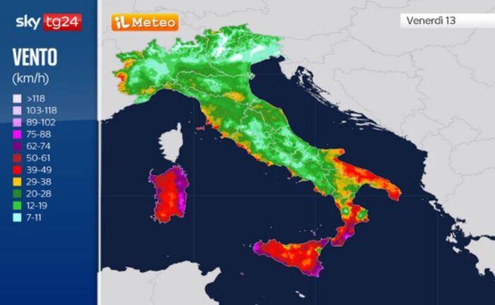 Le due cartine qui sotto mostrano che le zone più colpite nel corso di Giovedì 12 e Venerdì 13 Febbraio saranno tutto il versante tirrenico e le due Isole maggiori: il colore rosa chiaro, in particolare sulle coste nord-orientali della Sardegna per la giornata di Giovedì, indica un vento medio previsto tra gli 89 e i 102 km/h, ma le raffiche potranno superare agevolmente i 100 km/h.