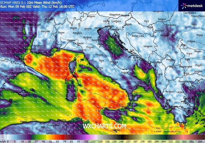 Le raffiche più violente colpiranno il basso Tirreno e i crinali del Centro-Sud appenninico, dove si potranno superare agevolmente i 100 km/h. Le correnti, provenienti prevalentemente dai quadranti occidentali, caricheranno di energia il bacino tirrenico, provocando mareggiate intense sulle coste vulnerabili con altezze medie previste tra i 4 e i 5 metri, fino a 6 metri sul Tirreno meridionale e coste nord-occidentali della Sardegna.