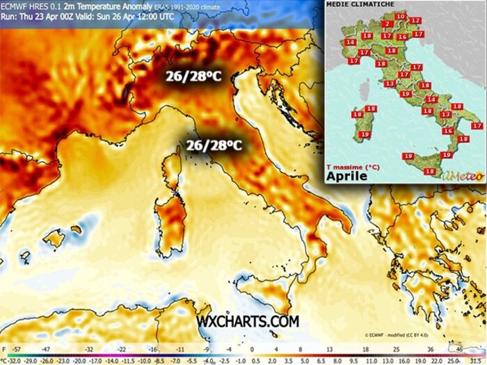 temperature massime al Nord e su parte del Centro nella giornata di Giovedì 23 Aprile, ecco che da Venerdì 24 Aprile le colonnine di mercurio