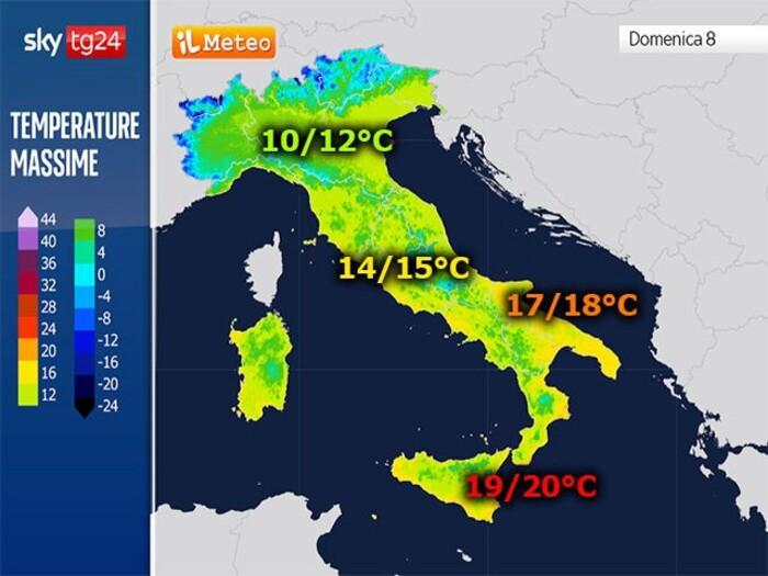 Salendo verso le regioni centrali, il caldo fuori stagione tenderà gradualmente ad attenuarsi, con valori intorno ai 14-15°C. Al Nord, invece, le temperature resteranno più contenute e difficilmente supereranno la soglia dei 10-12°C.