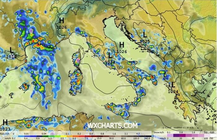 Nel corso del pomeriggio alcuni rovesci potranno estendersi anche verso la parte più settentrionale dell’Appennino, coinvolgendo i rilievi della Liguria e alcuni tratti dell’Appennino tosco-emiliano.