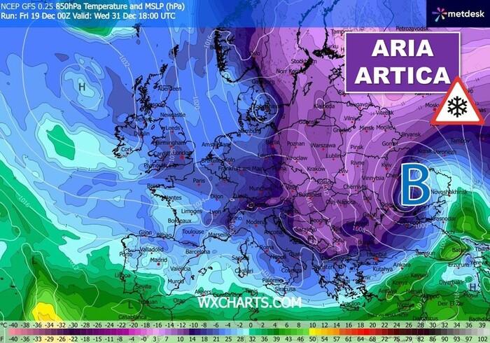 La mappa qui sotto mostra appunto le correnti gelide (in color viola le temperature più basse) in discesa dal Polo Nord tra la parte conclusiva di Dicembre e l'avvio del nuovo anno.