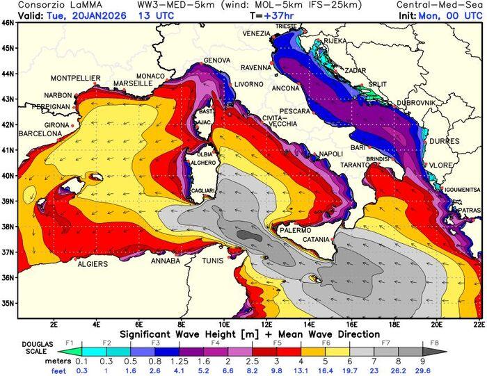 Il moto ondoso è destinato ad aumentare sensibilmente. L’altezza dell’onda significativa potrà toccare i 6-7 metri, mentre le onde massime al largo potrebbero raggiungere i 9 metri, specialmente nei Canali di Sicilia e Sardegna. Un fattore determinante sarà il fetch (la rincorsa dell'onda sulla superficie marina), che risulterà molto esteso, amplificando la forza dell'impatto sui litorali. Le province più a rischio per gravi mareggiate sono Catanzaro, Siracusa, Catania e Nuoro.
