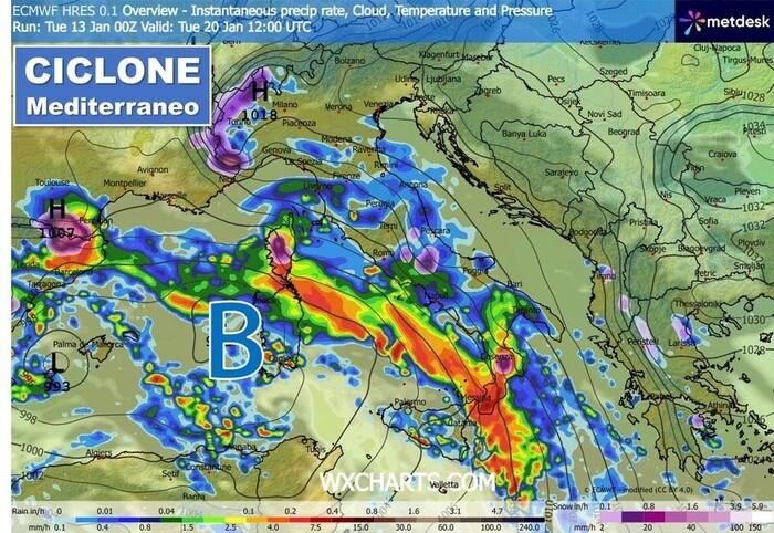 In particolare, le correnti atlantiche in ingresso andranno a interagire con masse d’aria più miti e umide presenti sul Nord Africa. Da questo contrasto prenderà origine un ciclone mediterraneo, destinato successivamente a isolarsi sui nostri mari.