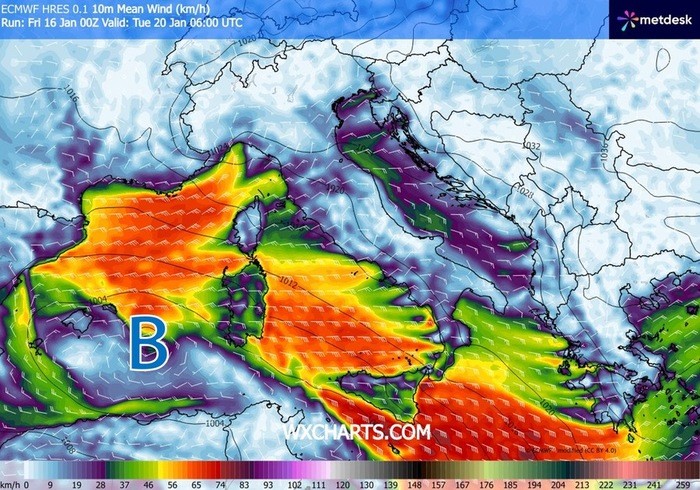 Già dal Lunedì 19 Gennaio soffierà lo Scirocco con raffiche a oltre 80/90 km/h su Sicilia, Sardegna, Calabria ionica e Puglia.