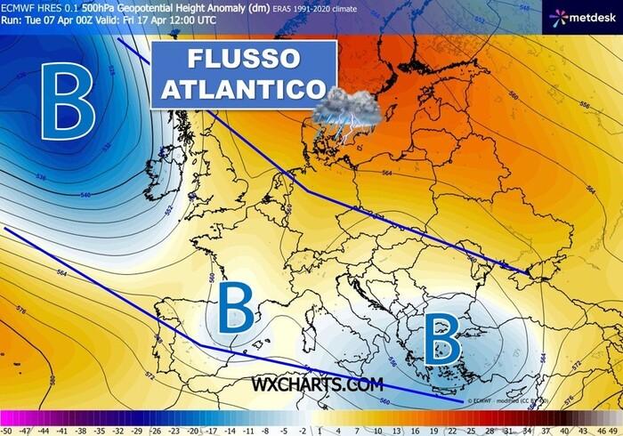 La tendenza sul lungo periodo (da metà Aprile in avanti) ipotizza dunque un'importante ripresa del flusso atlantico che potrebbe pilotare correnti fresche ed instabili dapprima sull'Europa occidentale, poi anche sull'Italia.