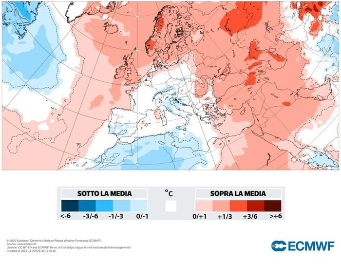Nonostante un quadro stabile, le temperature si manterranno piuttosto basse, soprattutto nelle ore notturne e al primo mattino, quando saranno possibili diffuse gelate nelle zone interne e di pianura. Le massime, pur in lieve ripresa, rimarranno comunque su valori inferiori alle medie del periodo. La causa di questo clima freddo, nonostante il tempo stabile, è il continuo afflusso di correnti molto fredde provenienti dal Nord Europa. Si verrà infatti a creare una sorta di corridoio gelido, all’interno del quale continuerà ad affluire aria di origine artica, mantenendo le temperature su valori bassi, almeno fino all'Immacolata.
