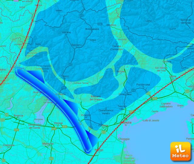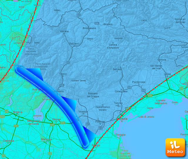 Immaginiamo di circoscrivere un'area di indagine, magari di alcune decine di migliaia di chilometri quadrati, come quella rappresentata nella prima immagine, nel settore del Nordest italiano. In linea di massima, appunto, può essere circoscritto l’ambito di azione della massa d’aria, in questo caso instabile, prevista transitare sull'area di riferimento, quella compresa tra le due linee tratteggiate in rosso. Dal possibile errore, anche millesimale rispetto al reale, nel dato iniziale, fornito pur esatto dalle rilevazioni, può derivare inevitabilmente una diversa traiettoria finale della massa d’aria, rispetto alla traiettoria tracciata. Ma le complessità enormi arrivano lungo il percorso.