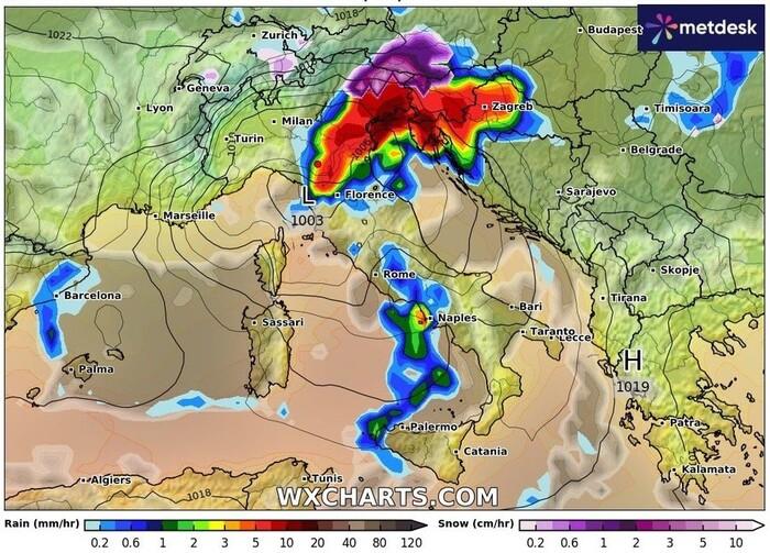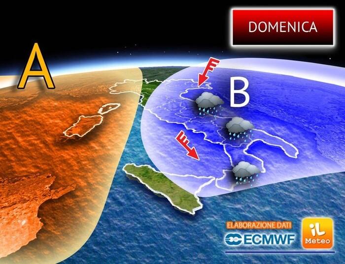 Questo fronte perturbato, carico di maltempo, sarà già in azione dalle primissime ore del mattino sulle regioni di nordest, dove piogge a tratti anche intense e locali temporali colpiranno subito l’Emilia Romagna, l’area più orientale della Lombardia e tutto il distretto del Triveneto.