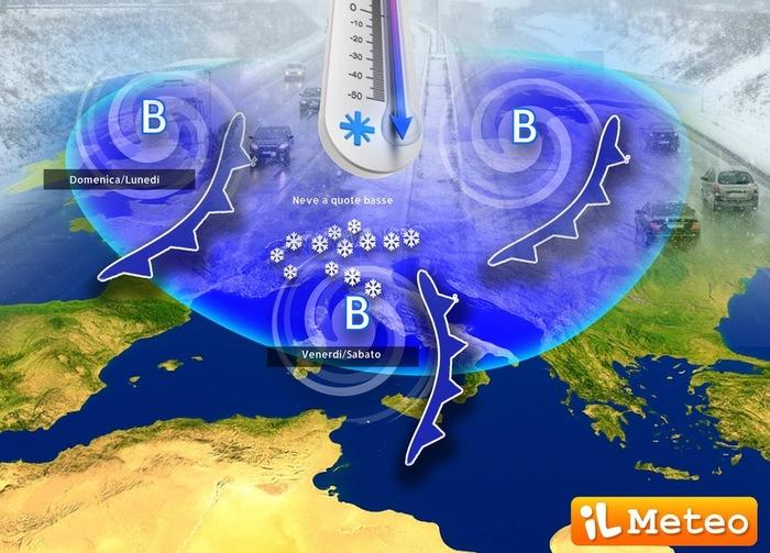 Domenica sarà la giornata migliore, con ampie schiarite ma anche freddo pungente: al mattino, complice la notte stellata, avremo minime decisamente sottozero al Nord anche in pianura, al Centro-Sud il tempo migliorerà salvo un po’ di incertezza nell'estremo meridione; dalla sera, però, peggiorerà nuovamente per l’arrivo del secondo ciclone polare dalla Groenlandia.