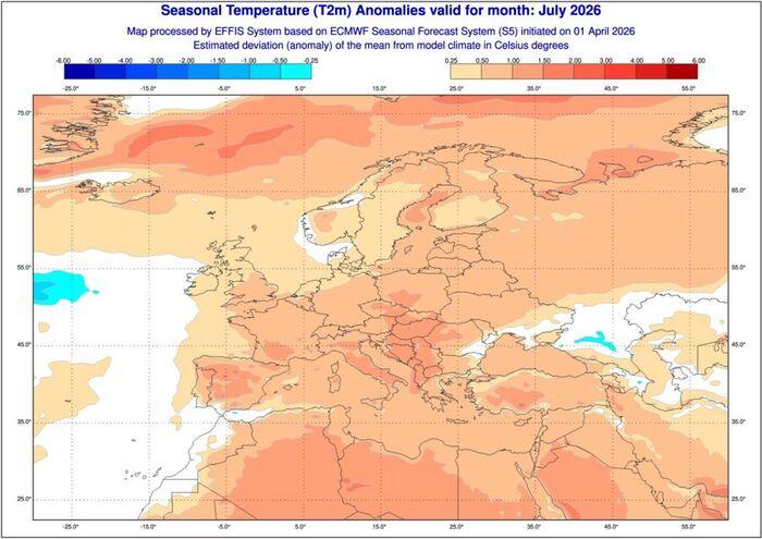 Le proiezioni indicano una forte probabilità che Luglio 2026 possa risultare il mese più caldo dell'intera stagione estiva, con anomalie termiche diffuse fino a +2/3°C oltre la media stagionale su tutta l'Italia e l'area mediterranea.