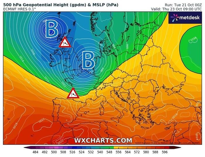 Una seconda e potente tempesta colpirà invece la Francia, la Germania e parte dei Paesi Bassi nel corso di Giovedì 23 Ottobre: si tratterà di un profondo ciclone atlantico con un minimo di 971 hPa. Su questi settori sono previste precipitazioni molto abbondanti, anche a carattere di nubifragio, che potrebbero provocare allagamenti e le temute alluvioni lampo. Sulle coste oceaniche francesi (Bretagna, Aquitania e parte dei Paesi Baschi in Spagna) sono attese raffiche di vento ad oltre 140 km/h con il serio di violente mareggiate. Il ciclone poi traslerà verso oriente innescando venti fortissimi lungo il Canale della Manica e a tutte le coste del Mare del Nord.