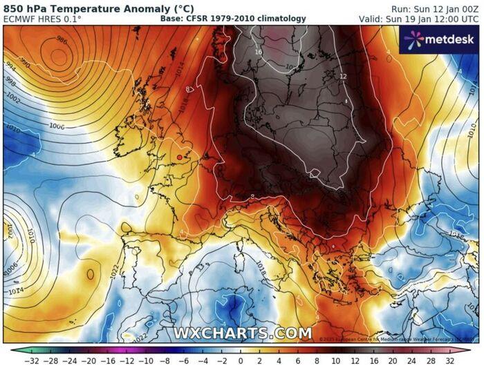 ANTICICLONE ANOMALO SULL'EUROPA. Dopo un'espansione verso il Nord Atlantico, l'alta pressione, tra Mercoledì 15 e Lunedì 20 Gennaio si piegherà e si coricherà dapprima sull'Europa occidentale e poi su quella centro-settentrionale. Il problema principale è che non si tratta di un'anticiclone classico, infatti i valori previsti sono anomali, la pressione potrebbe raggiungere i 1045 hPa sulla Germania (e non è la prima volta in questo inverno) e sulla Penisola Scandinava le temperature a 1500m sono previste toccare i +10/+12°C, ben 16°C oltre la media del periodo.