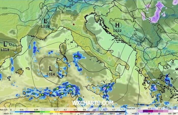 Il secondo fattore riguarda una blanda circolazione ciclonica che interessa soprattutto le due Isole Maggiori, strutturata attorno a due minimi di pressione: uno attualmente posizionato al largo delle coste orientali della Sardegna e l’altro in transito sulla Sicilia. Sarà proprio questa configurazione a favorire un contesto meteo instabile, con l’arrivo di piogge che interesseranno principalmente i settori orientali e meridionali di Sardegna e Sicilia. Con il passare delle ore, qualche precipitazione potrà estendersi anche all’area più meridionale della Calabria.