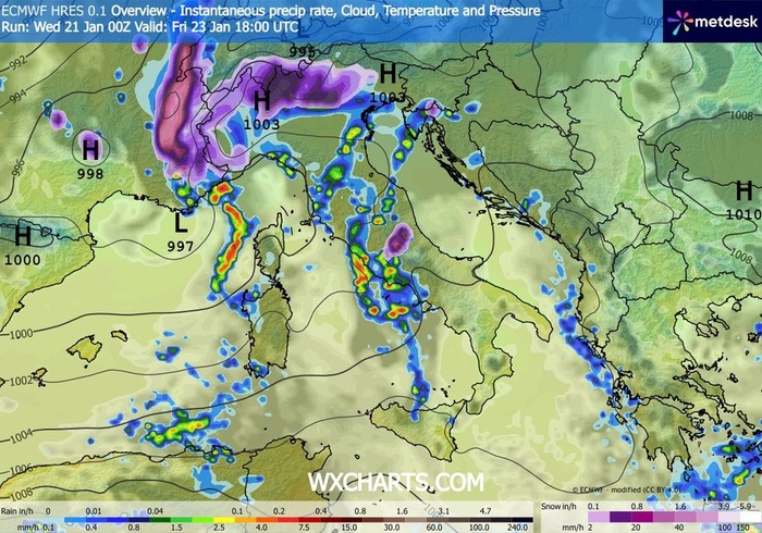 Il nuovo punto di svolta è atteso per la giornata di Venerdì 23 Gennaio. Sin dal mattino, il meteo volgerà al peggio sulle regioni di Nord-Ovest. Tornerà la pioggia e, a causa delle sacche d'aria fredda (il cosiddetto "cuscinetto") persistenti nei bassi strati, la neve potrebbe spingersi fino a quote molto basse: