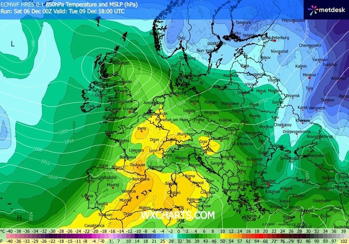 Sul fronte opposto, l'Europa è dominata da un'ampia e persistente circolazione più mite, troppo mite per il periodo, impedendo l'arrivo di masse d'aria fredda.
