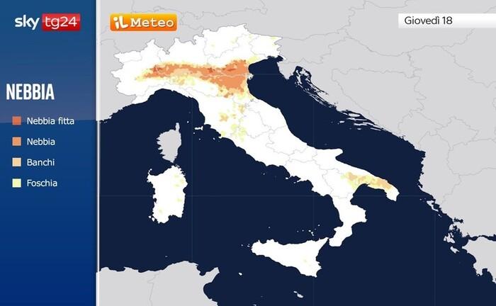 La maggiore stabilità atmosferica dovuta alla presenza di un'area di alta pressione in progressivo rafforzamento e l'assenza di vento favoriranno il ritorno delle nebbie su diverse aree di pianura del Nord, parte delle zone interne del Centro e sulla Puglia.