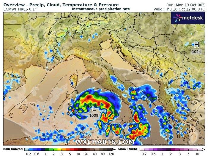 Tra Mercoledì 15 e Giovedì 16 Ottobre la situazione evolverà in modo più netto verso un severo peggioramento: la bassa pressione dalle Baleari si porterà infatti verso l’Italia, attestandosi tra Sardegna e Sicilia, e determinando un deciso deterioramento del tempo sulle Isole maggiori, sulle regioni del medio e basso Tirreno, con successivo coinvolgimento anche del versante adriatico, in particolare di Abruzzo e Molise.