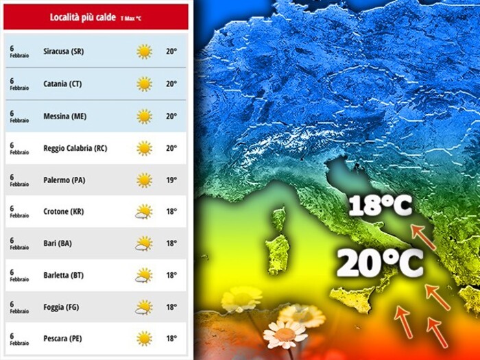 Sotto osservazione soprattutto la Sicilia: qui i 20°C verranno raggiunti e localmente superati in diverse città, in particolare a Siracusa, Catania e Messina. Valori sopra la media stagionale sono previsti anche sul resto del Meridione: in Puglia si toccheranno i 17-18°C tra Barese e Foggiano, mentre lungo il versante adriatico centrale, città come Pescara vedranno massime intorno ai 18°C, favorite dall'effetto di caduta dei venti dai rilievi.