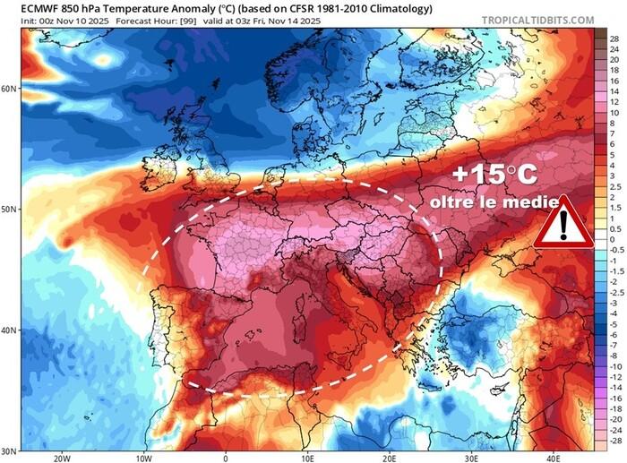 La cupola anticiclonica favorisce temperature eccezionalmente elevate in quota. A circa 1.500 metri di altitudine (850 hPa) si potranno raggiungere e persino superare i +15°C: si tratta di anomalie termiche molto marcate, fino a circa 12°C al di sopra della media stagionale nel cuore dell'Europa. Ci sarà qualche grado in meno sul nostro Paese, ma con valori comunque molto miti per questo periodo.
