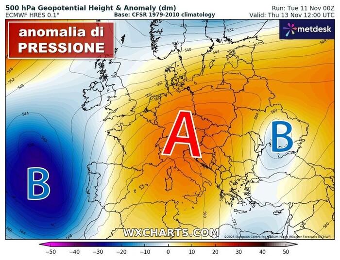 Il colosso anticiclonico che terrà in ostaggio l'Italia nei prossimi giorni favorirà temperature eccezionalmente elevate in quota. A circa 1.500 metri di altitudine (850 hPa) si potranno raggiungere e persino superare i +15°C: si tratta di anomalie termiche molto marcate, fino a circa 10°C al di sopra della media stagionale nel cuore dell'Europa. Ci sarà solo qualche grado in meno sul nostro Paese, ma con valori comunque molto miti per questo periodo.
