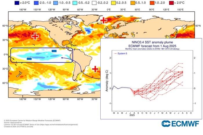 La Niña rappresenta la fase fredda del fenomeno climatico conosciuto come ENSO (El Niño – Southern Oscillation), un complesso sistema di correnti oceaniche in grado di influenzare le dinamiche atmosferiche in molte aree del Pianeta. Durante questa fase, le acque del Pacifico equatoriale centro-orientale si raffreddano rispetto alla norma. Questo raffreddamento altera la circolazione atmosferica tropicale, spostando i grandi sistemi di alta e bassa pressione e influenzando di conseguenza il clima a scala globale. Ne derivano, ad esempio, precipitazioni più intense nel Sud-Est asiatico e in Australia, mentre in altre aree, come il Sud America occidentale o parte degli Stati Uniti, prevalgono condizioni più secche e fresche. La mappa qui sotto mostra bene il raffreddamento delle acque dell'Oceano Pacifico atteso nei prossimi mesi.