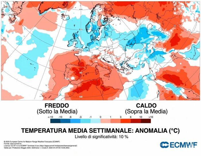 La prima parte di Maggio sarà caratterizzata da temperature ben sopra la media climatica, con scostamenti rispetto ai valori di riferimento addirittura di +3°C su buona parte del bacino del Mediterraneo, Italia compresa. Al momento le anomalie più pesanti sembrerebbero interessare le regioni alpine, ma anche il resto dei settori registrerà valori piuttosto elevati grazie ad una persistente e costante presenza di un'area di alta pressione. Non sono da escludere delle ondate di caldo di stampo pienamente estivo in grado di farci superare agevolmente i 30°C, specie in caso di avanzate del temibile anticiclone africano.
