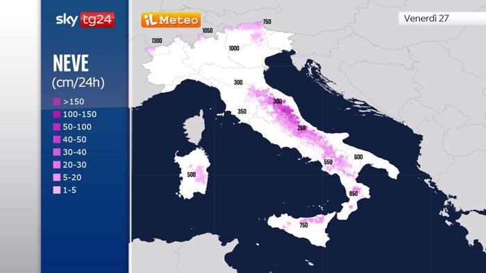 Sul resto dei rilievi del Centro i fiocchi scenderanno generalmente oltre i 600 metri e su quelli del Sud sopra i 600/800 metri, con possibili sconfinamenti a quote inferiori nelle fasi di precipitazione più intensa.