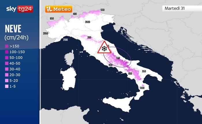 La fase più critica colpirà proprio tra Mercoledì 1 e Giovedì 2 Aprile, con l'Abruzzo nel mirino delle precipitazioni più abbondanti. Qui la neve scenderà a quote insolitamente basse per il periodo, imbiancando le colline, localmente fino a 500 metri, con accumuli oltre al mezzo metro in 72 ore sulle zone montuose. Località come Roccaraso e Campo imperatore sperimenteranno vere e proprie bufere di neve come non si vedeva da tanto tempo. Le nevicate interesseranno anche i rilievi del Molise fino a 700-800 metri nonché quelli di Campania, Basilicata, Calabria e Sicilia a quote superiori ai 1200-1300 metri. Possibili nevicate fino a quote molto basse infine anche sulle Alpi di confine.