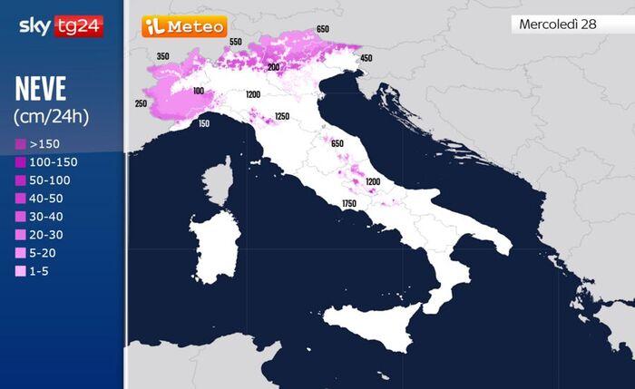 Gli accumuli nevosi potrebbero risultare consistenti, anche oltre i 20-30cm sopra i 1000 metri in sole 24 ore, con picchi di 50cm sulle Alpi marittime.