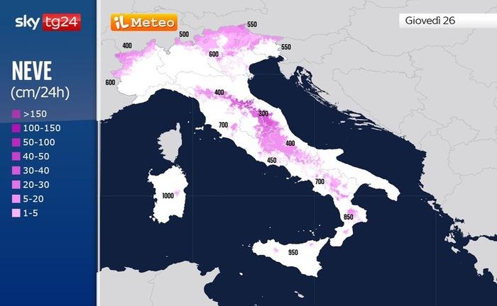 Sul resto dei rilievi del Centro i fiocchi scenderanno generalmente oltre i 600 metri e su quelli del Sud sopra i 600/800 metri, con possibili sconfinamenti a quote inferiori nelle fasi di precipitazione più intensa.